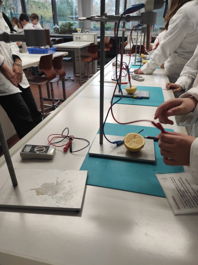 Betreut und angeleitet wurden die kleinen Forscher durch Tutoren aus den MINT-Klassen 9 bis Q1, die selbstbewusst ihre Kenntnisse weitergaben und Unterstützung bei der Umsetzung der Experimente anboten.